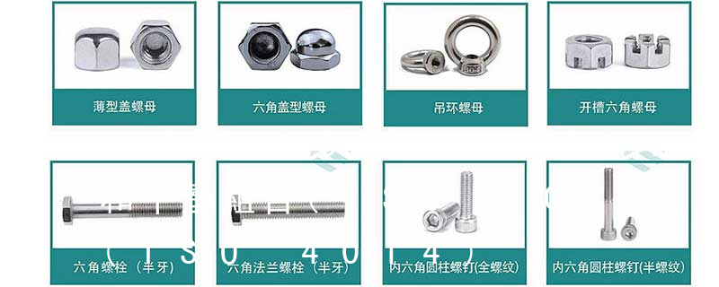 螺栓類:外六角螺栓、外六角法蘭面螺栓、內六角圓柱頭螺栓、吊環螺栓、膨脹螺栓、沉頭內六角螺栓、盤頭內六角螺絲、馬車螺栓、雙頭螺栓、蝶型螺絲、活節螺栓、地腳螺 栓、U型螺栓、四角螺栓等 螺帽類:鉚螺母、吊環螺母、